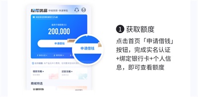 点击首页「申请借钱」按钮,完成实名认证+绑定银行卡+个人信息,即可查看额度