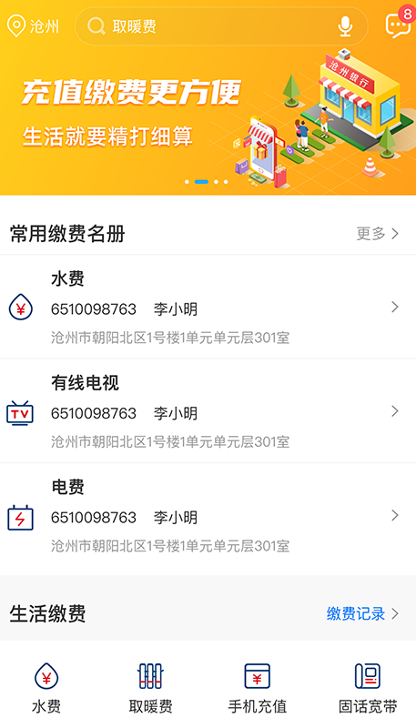 2、生活缴费:自助缴纳多种日常费用,如固定电话费、手机费、有线电视和取暖费等,可在常用缴费名册中查询和管理常用缴费项目。