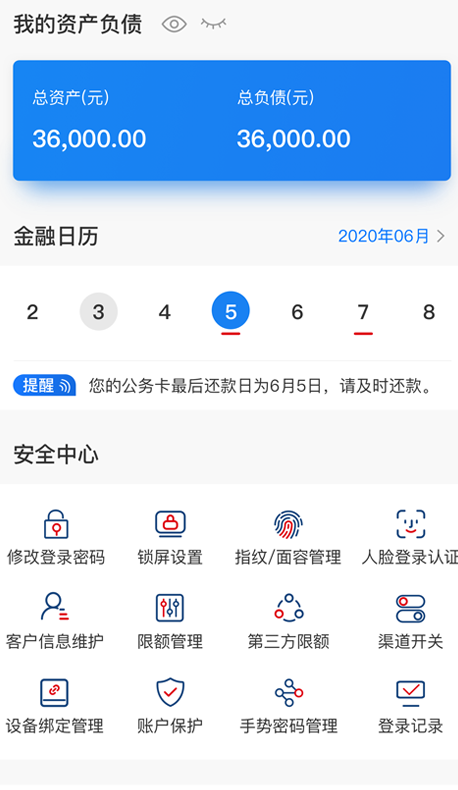 7、账户管理:随时随地获取本人手机银行关联账户信息,查询借记卡账户余额、交易明细及开户网点查询,公务卡的额度、账单及分期服务,同时提供在线办理口头挂失服务等。