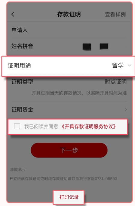 5.选择“证明用途”勾选《开具存款证明服务协议》,点击“下一步”此页面可点击“打印记录”’,查询存款证明的下载记录