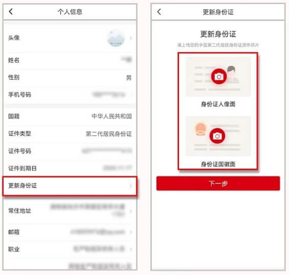 2.点击“更新身份证”进入更新身份证页面后,点击页面中“红色相机”按钮
