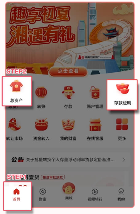 3.进入首页-点击“总资产”或“存款证明”入口