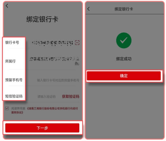 6.输入需要绑定的银行卡号、手机号码、验证码等信息,完成银行卡绑定。