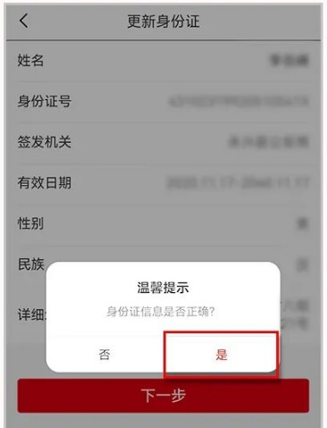 4.请复核身份证信息是否无误,信息正确选择“是”,更新成功。