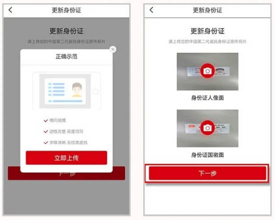 3.按照指引,完成身份证正反面照片上传后,点击“下一步”
