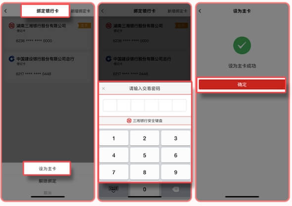 7.在“绑定银行卡”页面将“新绑定银行卡”设置为“主卡”,完成电子账户更换银行卡操作。