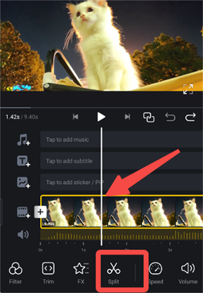 3、导入视频或图片素材,滑动进度条并使用“Split”进行分段剪辑。