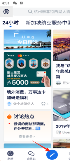 1、打开飞客FLYERT App,点击底部中间的“笔”图标进入发布页面。