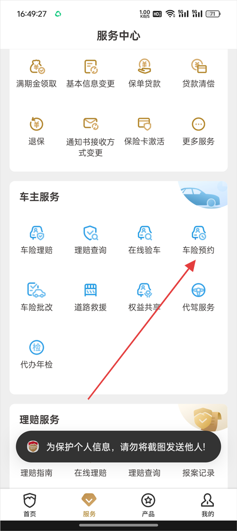 2、找到【车主服务】,选择【车险预约】;