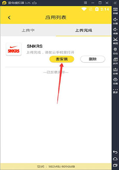 4、安装应用至云端应用上传完成后,点击安装选项,将app安装到云手机,安装过程自动完成。