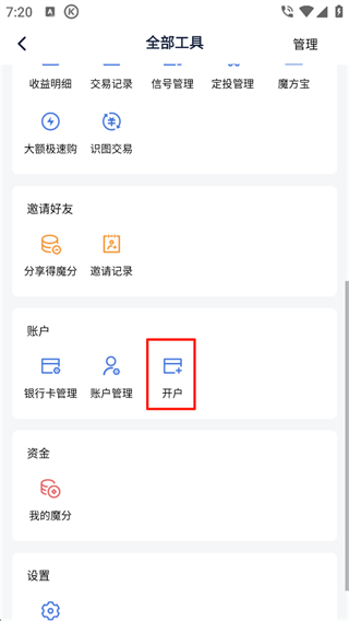 2、往下滑动找到【开户】