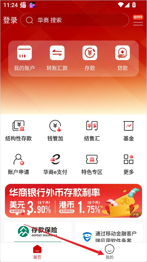 1、打开华商银行App,在首页右下角点击“我的”;