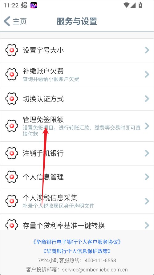 3、点击“管理免签限额”进入设置页面;