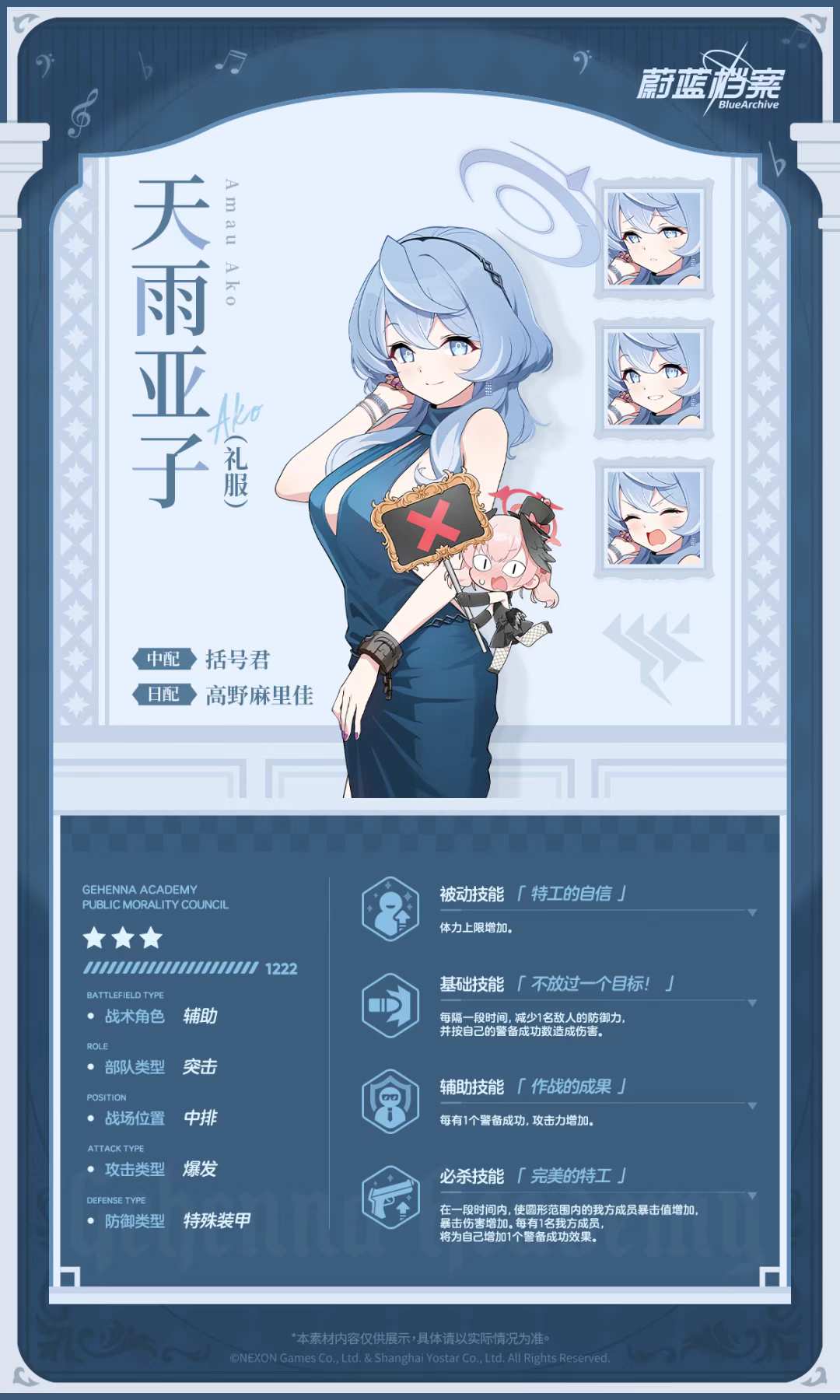 为了在歌赫娜的特别宴会上也能一如既往地辅佐日奈,自己也果断穿上了礼服。她平时处理事务的能力本就滴水不漏,受到风纪委员会众成员的敬仰,而这次她会更上一层楼,以完美特工的身份大显身手……自信满满的亚子如是说。