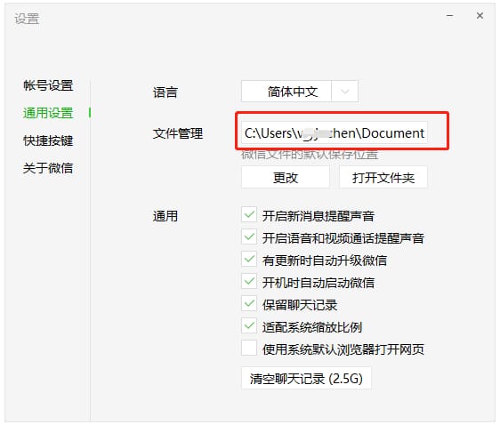 1、登录账号,从设置 �C 通用设置中 找到对应路径,默认是C:\我的文档\WeChat Files\;(注:此指引适用于2.6.3版本以上的PC微信)