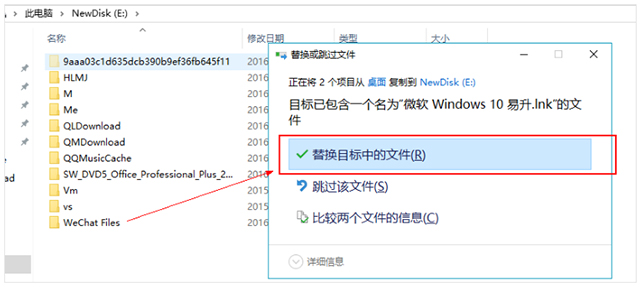 4、用迁移过来的WeChat files 覆盖至新电脑B的WeChat Files. 选择替换目标中的文件;