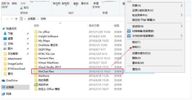 3、将 wechat files 复制后通过云端或U盘,QQ等发送至需要迁移的新电脑 B;