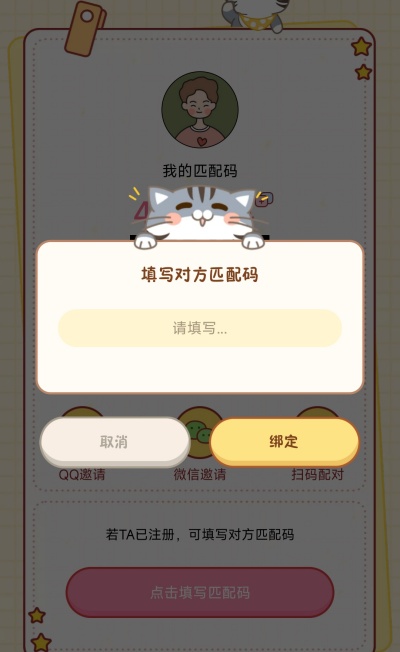 1、下载安装心动日常App后进入应用首页,可选择邀请对象进行情侣配对,或点击“填写匹配码”进入绑定入口。