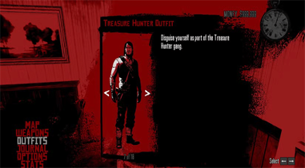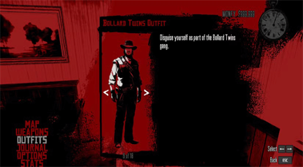 如何解锁:要找回这套服装,必须满足一系列条件:找到所有的碎片。在所罗门的愚行周围搜寻。完整的里奇伍德农场入室盗窃。在犰狳游戏中,击败所有人。带着沃尔顿帮派赏金(活着)返回。当沃尔顿帮派攻击乔拉泉时,保护它。所有的废料都去盗贼登陆的裁缝店买这套衣服。