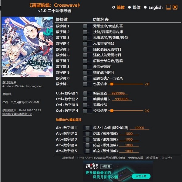 碧蓝航线Crosswave二十项无敌修改器,