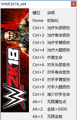 WWE 2K18 十三项修改器一款针对于同名游戏WWE 2K18所打造的一款多项游戏属性修改工具。该修改器支持身体、手臂、大腿损伤的治愈、恢复生命、对手头部受伤、对手身体受伤、对手手臂受伤、对手大腿受伤、减少对手生命等多重修改功能,能够让玩家轻松的过关游戏,从而可以更好的体验游戏带来的乐趣。WWE 2K18作为一款由Visual Concepts制作,2K Games发行的体育格斗类游戏,是WWE 2K游戏系列的最新作品。WWE 2K18加入了全新的游戏模式:八人比赛制,解锁全新的擒抱系统,还有全新的重量侦测机制。WWE2K18游戏将会拥有更加豪华的明星阵容,超过130位超级明星将在游戏中现身,甚至还有全新的生涯模式等你来体验,有需要的朋友可以下载看看哦。