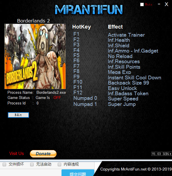 无主之地2十四项修改器是一款非常强大的针对于无主之地2游戏所开发的一款多功能游戏修改器,在游戏了遇到强敌卡住了过不了关?不会加点导致人物属性混乱不和谐,想要流畅又快捷的通关速度?这些问题统统不是事,小编今天带来的无主之地2十四项修改器就能够给你带来前所未有的畅快感,让你无限生命无限子弹,白板枪也能干翻强力BOSS,无视一切向前冲,玩家所要做的只是打开游戏,运行修改器,通过相应的热键来修改属性以及增加道具,不仅仅是这些属性,这款修改器用超多功能属性等你去了解。赶紧下载体验吧!