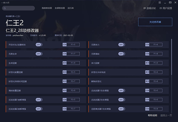 仁王2二十八项修改器是针对于仁王2游戏制作而成,此修改器相对于其他仁王2修改器而言,软件内修改功能更加全面丰富,拥有二十八项修改功能,如无限生命、无限体力、满九十九武器槽、无限弹药、一击必杀等等功能,并且操作简单易上手,丝毫不影响游戏的流畅性,为喜爱仁王2游戏的玩家带来了极大的便利性与畅快的游戏体验,为了帮助玩家感受极致的游戏体验。仁王2是一款TeamNinja制作的魂系动作类游戏,以古代日本战国后期为游戏故事背景。游戏继承了仁王1的优秀风格,残酷地融合日本神话,传说和历史,加入了全新的战斗方式“妖怪化”、使游玩的体验和成就感达到前所未有的高度。如有感兴趣的玩家,快来搭配上仁王2二十八项修改器畅游吧!