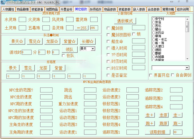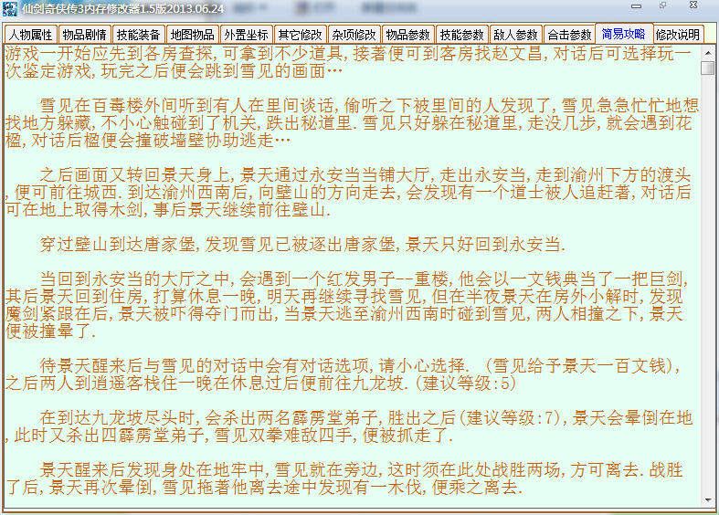 仙三修改器是网友们根据国产角色扮演游戏仙剑奇侠传三制作的游戏修改器。这款修改器对于游戏的内容修改非常全面,包含了人物属性、物品剧情、技能装备、敌人参数等等内容的修改非常全面,为了方便玩家可以顺利的过关,还特地内置了游戏攻略可以玩家可以快速通过这款单机游戏。做为国产单机角色扮演中的经典游戏,仙剑奇侠传三也是首次使用3D画面的仙剑游戏,无论是战斗还是内置的CG动画都给玩家带来了不一样的游戏体验,不过游戏唯一的缺点就是不能进行切屏,不然就无法再次进入游戏了。而仙三修改器的修改内容虽然比较详细,但是部分内容还是需要在窗口化的时候比较好用,小编建议大家再使用的时候再去安装一个窗口化的补丁。