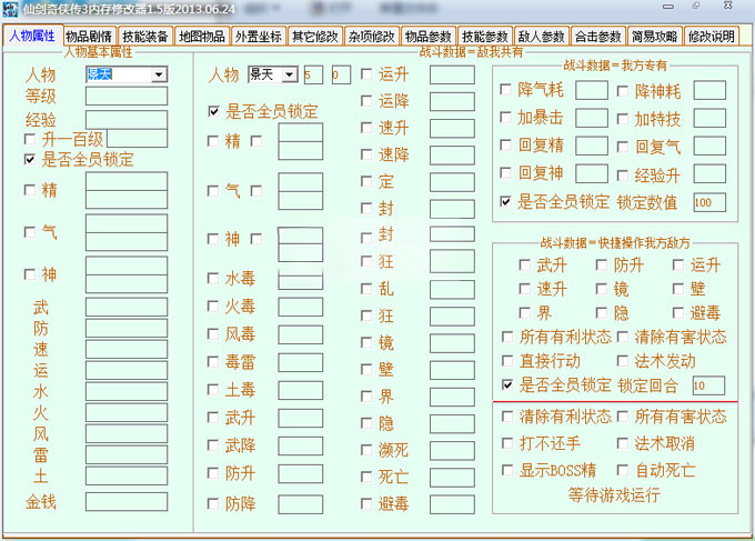 (可在“战斗数据=快捷操作我方敌方”分隔线上面的“是否全员锁定”,选择是为全部在队人员锁定,选择否为当前修改器选择人物锁定,锁定数值为“是否全员锁定”后面锁定回合中的值)