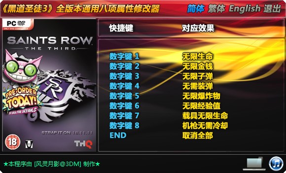 黑道圣徒3修改器风灵月影是一款根据同名游戏制作的辅助工具,功能强大,给玩家降低游戏难度,更改角色人物的属性,可以享受刺激劲爆的游戏体验。该软件支持八项属性修改,包括生命、金钱、载具、经验、子弹等,玩家可以随时开启,降低游戏难度,挑战起来更加好玩。强大的辅助功能,绿色无需安装,不会影响用户的游戏体验,游戏画质也是非常的真实,让你在玩的过程中更加有代入感。开放式地图和剧情,搞怪的无厘头风格,刺激的冒险玩法,你必须利用超能力和奇怪的武器从外星领主Zinyak的魔爪下拯救地球,感兴趣的朋友欢迎下载体验吧,更多属性等你来开启。