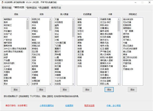 图鉴成就窗口:添加所有成就、添加钓品图鉴、敌人怪物图鉴、添加卡牌、添加博物词条、探险笔记。