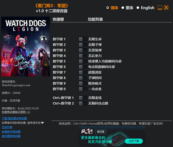 看门狗军团是一款第三人称射击角色扮演游戏,之前本站给大家带来了这个款游戏,而本次小编给大家带来的是看门狗军团修改器,该软件能够修改游戏里的一些数据,比如:无限生命,无限子弹,无后坐力,快速黑入功能瞬间冷却,电击陷阱瞬间冷却,超级速度,隐身模式,无限金钱,等等,以后大家在游戏中碰到问题,就可以修改数据,做到自己想做的了,而且该软件对于新手玩家来说,非常的友好,能够帮助他们很快的了解游戏,而且是在有游戏体验的前提下去理解游戏,非常的不错,有需要的朋友欢迎来本站免费下载哦!