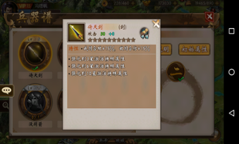 点击解锁的兵器即可以看到有关兵器的说明和其初始属性,目前一开始自动解锁的兵器只有“倚天剑”(根据游戏开始选择的武将不同自动解锁的神器也不同,曹操-倚天剑,刘备-雌雄双股剑,孙坚-古锭刀),所以我们这里就拿最简单的“倚天剑”来举例吧!