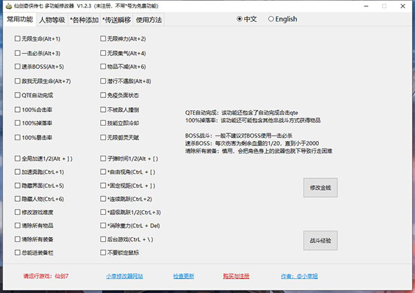 仙剑奇侠传7多功能修改器小幸版,这是由小幸大神专为此游戏制作的一款游戏辅助工具。该修改器版本为绿色版本,使用起来极为的便捷,玩家只需要在本站下载安装,然后打开游戏再开修改器即可使用,并且它还能够为玩家们提供许多修改功能,支持常用功能、人物等级、各种添加、等多种多样的修改功能,全方位满足玩家的游戏需求,大幅度减小游戏的难度。同时仙剑奇侠传7多功能修改器还支持中文、英文两种语言,安全无毒无广告,但为了避免丧失游戏的体验性,小编还是建议大家适当的进行修改,还在等什么,有需要的玩家快来下载使用吧!