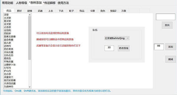 各种添加窗口:添加/删除物品、装备、饰品。万象、卡牌、队伍角色入队/离队、御灵、成就