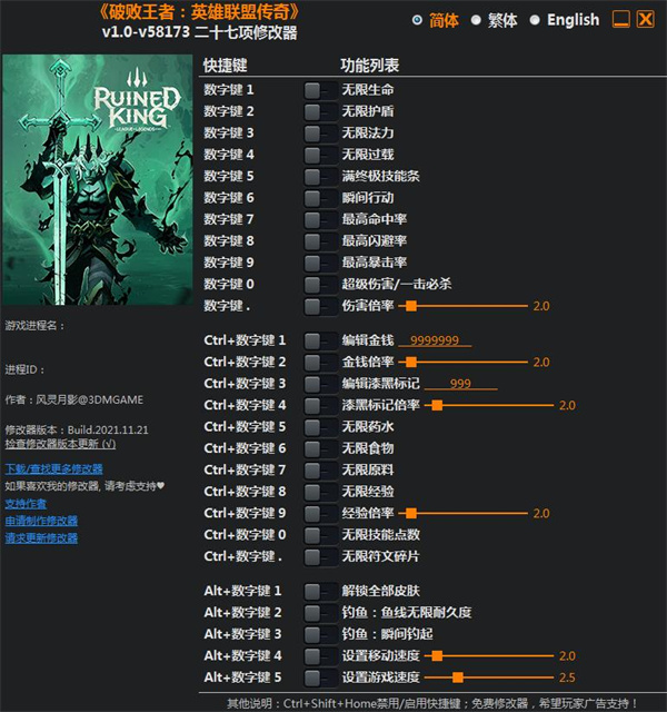 破败王者英雄联盟传奇修改器,有无限生命/护盾/法力/过载、超级伤害/一招致命、编辑金钱、无限食物、无限技能点数、无限符文碎片、解锁全部皮肤等27项修改功能,它能够帮助玩家得到更便捷的游戏体验,喜欢破败王者英雄联盟传奇游戏的玩家可以下载破败王者英雄联盟传奇修改器体验。