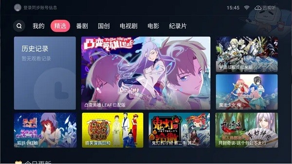 tv版的界面,目前顶部导航只有七个[我的 精选 番剧 国创 电视剧 电影 纪录片],个人关注的up主视频暂时无法直接使用tv客户端观看。