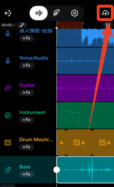 1、进入音频编辑页面后点击右上角云朵与箭头图标,进入项目保存与导出功能界面。